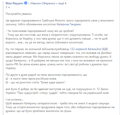 Видео разместил юрист Маси Найем, который возмущен тем, что у адвоката грамотная русская речь, и на суде он, нарушая ст. 12 Закон Украины "О судоустройстве и статусе судей", говорил на русском языке.