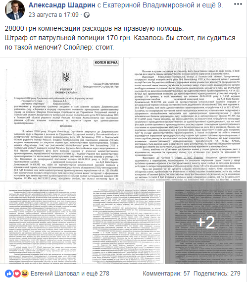 Дзержинский районный суд Харькова не только отменил постановление полицейского о наложении административного взыскания в размере 170 гривень, но и постановил взыскать в пользу истца 28 тысяч гривень на судебные расходы.