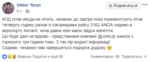 "Самолет никуда не летит. Ждем до завтра пока отремонтируют самолет. Вместе с пассажирами рейса 2162 ANDA сидим в аэропорту Анталии, хотя давно уже должны были отсюда вылететь. Что будет дальше неизвестно - представители компании @JoinUp исчезли с горизонта три часа назад. С тех пор ни одной информации. Сидим, ожидаем, чем завершится путешествие домой", - написал Таран.