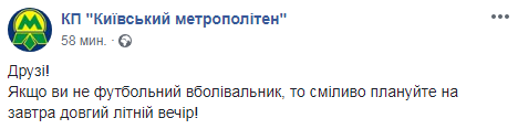 Вместе с тем, в этот день метро будет работать на час дольше. Последний поезд из центра Киева отправится около 01:15 ночи уже в календарную среду.