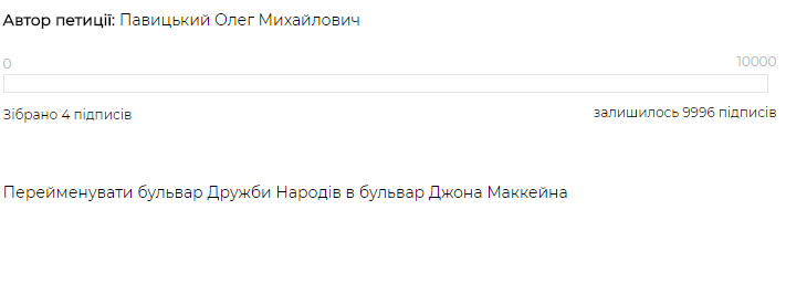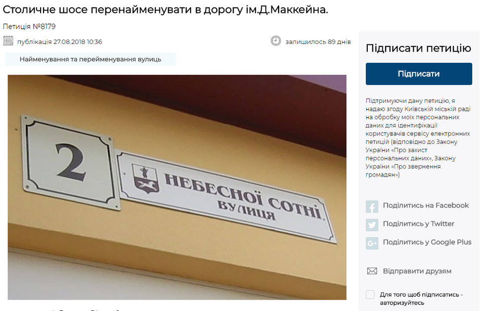 Автор одной из петиций предложил переименовать Столичное шоссе в дорогу имени Джона Маккейна. "Великий друг Украины, который подал много санкционных инициатив в отношении РФ сенату США в поддержку Украины", - отмечается в петиции.