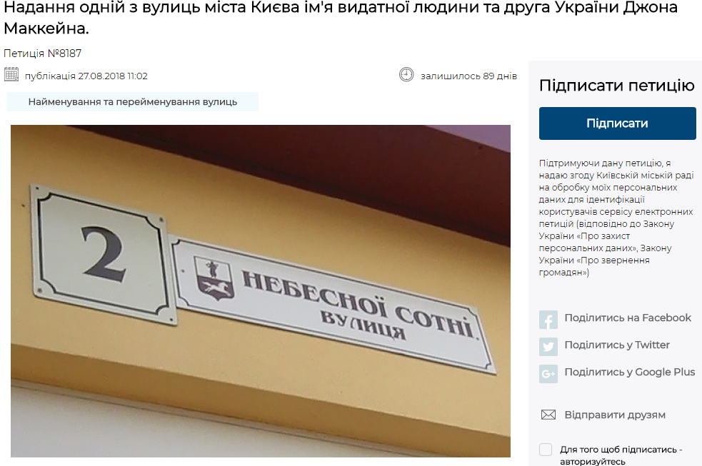 В понедельник, 27 августа, на сайте Киеврады зарегистрировали несколько петиций с просьбой присвоить различным объектам в Киеве имя американского политика Джона Маккейна. Он умер 25 августа 2018.