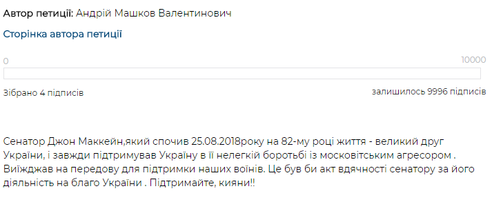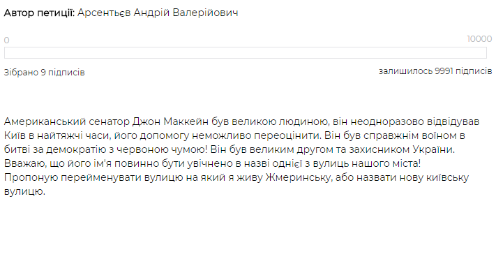 Также среди зарегистрированных петиций - предложения переименовать в честь американского политика бульвар Дружбы Народов (4 подписей), который ранее едва не стал бульваром Михновского, одну из улиц Киева (9 подписей) или парк (4 подписей). Джон Маккейн скончался 25 августа 2018 в возрасте 82 лет. На протяжении последнего года он боролся с опухолью мозга.