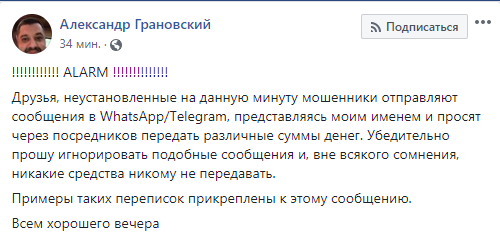 "Друзья, неустановленные на данную минуту мошенники отправляют сообщения в WhatsApp/Telegram, представляясь моим именем и просят через посредников передать различные суммы денег. Убедительно прошу игнорировать подобные сообщения и, вне всякого сомнения, никакие средства никому не передавать", - написал Грановский.
