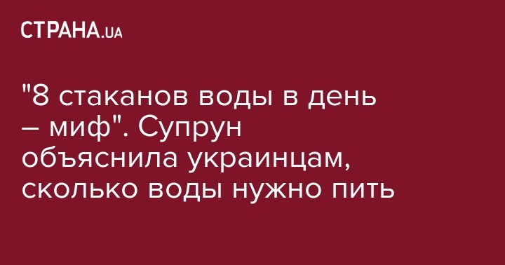 "Миф о необходимости пить 8 стаканов воды даже сегодня встречается довольно часто. Наряду с утверждениями, что питье литров воды ежедневно помогает избавиться от морщин, очистить организм от токсинов, помочь похудеть и даже улучшить работу здоровых почек. Сегодня никто точно не знает, откуда пошло убеждение о восьми стаканах", – написала Супрун.