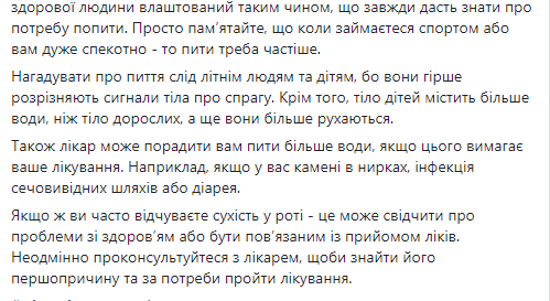 "Кроме того, врач может посоветовать вам пить больше воды, если этого требует ваше лечение. Например, если у вас камни в почках, инфекция мочевыводящих путей или диарея. Если же вы часто ощущаете сухость во рту – это может свидетельствовать о проблемах со здоровьем или быть связанным с приемом лекарств. Непременно проконсультируйтесь с врачом, чтобы найти первопричину и при необходимости пройти лечение", – отметила Супрун.