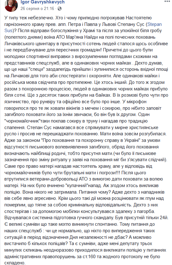 "В их разговоре было слышно о язычестве, о Рунвере и официально в микрофон о том, как хоронили викингов с мечом и топором, о якобы завещании погибшего похоронить его по их обычаю, потому что он был их другом. Один "чернорубашечник" таки положил топор в гроб и напомнил о традиции сожжения", - написал Игорь Гавришкевич.