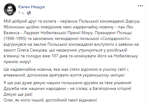 "Мой хороший друг и коллега - руководитель Польской киноакадемии Дариуш Яблонски только что сообщил мне чрезвычайную новость - господин Лех Валенса - Лауреат Нобелевской Премии Мира, Президент Польши (1990-1995 гг.) и основатель легендарной польской "Солидарности", откликнулся на призыв Польской киноакадемии выступить с заявлением в защиту Олега Сенцова, который незаконно удерживается в российской тюрьме и голодает уже 107 дней и номинировать его на Нобелевскую премию мира! Это чрезвычайная новость, которая должна стать известной во всем мире и, уверен, поможет спасти жизнь украинскому режиссеру! Я еще раз благодарю наших польских друзей за такое решение! Дружба между нашими народами - не слова, а многолетняя история! Спасибо еще раз! Олег, как никто другой, достойный такой премии!", - написал Нищук.