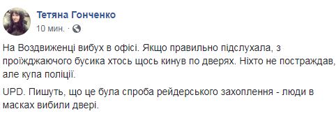 В Подольском районе по адресу Воздвиженская, 56 в Киеве неизвестные атаковали офис. Как сообщает блогер Татьяна Гонченко в Facebook, офис был взорван. К счастью, никто не пострадал, но силовиков приехало очень много.