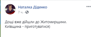 "Дожди уже дошли до Житомирщины. Киевщине  - приготовиться", -написала Диденко