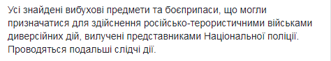 "Правоохранители извлекли из тайника 4 тротиловых шашки, 3 детонатора, 7 выстрелов ВОГ-25, 1 выстрел ВОГ-25П, 42 патрона калибра 5,45 мм, 334 патрона 7,62х54 мм, 36 патронов 7,62х39 мм, 19 гранат РГД-5, 17 гранат Ф-1 и 16 запалов к ним. Все найденные взрывные предметы и боеприпасы… изъяты представителями Национальной полиции", - говорится в опубликованном сообщении.