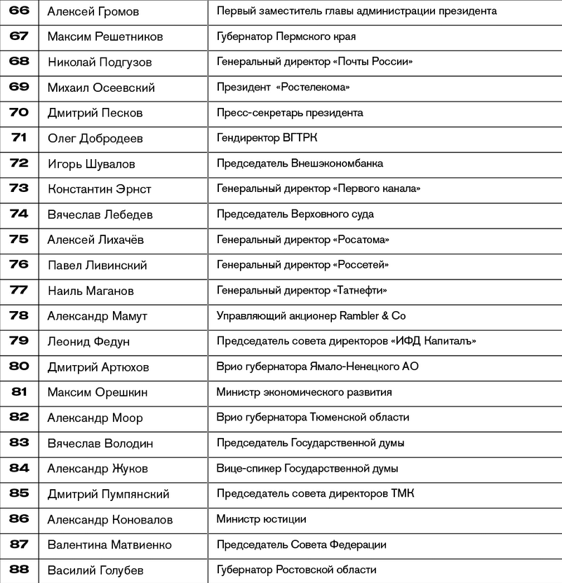 В первую пятерку вошли председатель правления Сбербанка Герман Греф и глава "Газпрома" - Алексей Миллер, главный исполнительный директор "Роснефти" Игорь Сечин и премьер-министр Дмитрий Медведев.