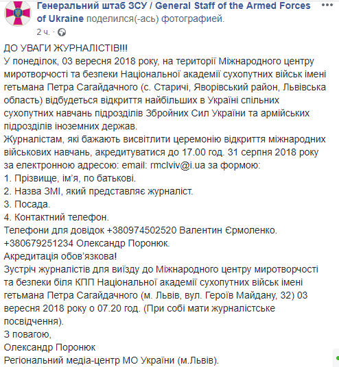 Сообщается, что открытие учений состоится в Международном центре миротворчества и безопасности Национальной академии сухопутных войск имени гетмана Петра Сагайдачного в селе Старычи Яворивского района Львовской области.