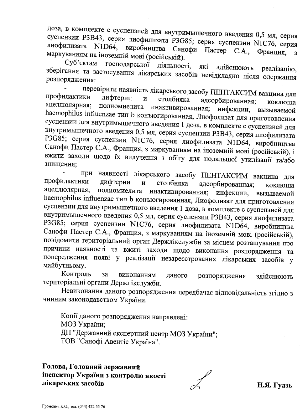 "Запретить реализацию, хранение и применение лекарственного средства Пентаксим, вакцина для профилактики дифтерии и столбняка, коклюша и полиомиелита 0,5 мл, различных серий, французского производства, из-за нарушения требований украинского законодательства", - сказано в документе.