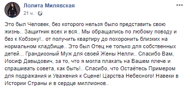 "Защитник всех и вся… Мы обращались по любому поводу и без к Кобзону! От получить квартиру до похоронить близких на нормальном кладбище… Это был отец не только для собственных детей…", - написала о нем певица родом из Украины Лолита.