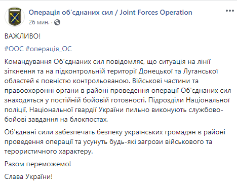 Позже на странице Операции объединенных сил в соцсети Facebook появилось сообщение о том, что военные части и правоохранительные органы в районе проведения ООС "находятся в постоянной боевой готовности".