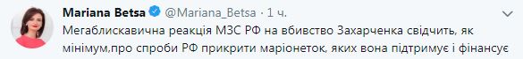 "Мегабыстрая реакция МИД РФ на убийство Захарченко свидетельствует, как минимум, о попытках РФ прикрыть марионеток, которых она поддерживает и финансирует", - написала Беца.