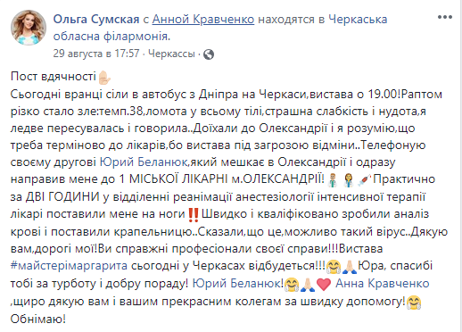 Всеми деталями инцидента актриса поделилась на своей странице в Facebook: "Пост благодарности. Сегодня утром сели в автобус из Днепра  в Черкассы, представление в 19:00! Вдруг резко стало плохо: температура 38, ломота во всем теле, жуткая слабость и тошнота, я чуть передвигалась и говорила. Доехали до Александрии, и я понимаю, что надо срочно к врачам, потому что спектакль под угрозой отмены. Звоню своему другу Юрию Беланюку, который живет в Александрии, и сразу направил меня в 1 Городскую больницу Александрии! Практически за 2 часа в отделении реанимации, анестезиологии, интенсивной терапии врачи поставили меня на ноги. Быстро и квалифицированно сделали анализ крови и поставили капельницу. Сказали, что это, возможно, такой вирус. Спасибо вам, дорогие мои! Вы настоящие профессионалы своего дела", – написала она и разместила фото с врачами.