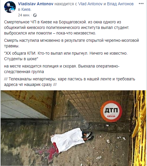 В Киеве в районе Борщаговской произошло смертельное ЧП: из окна одного из общежитий выпал молодой человек.  Об этом сообщает блогер Владислав Антонов на странице в Facebook.