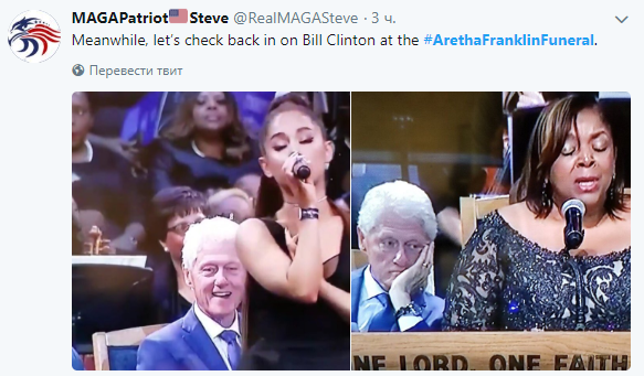 Вчера, 31 августа, в Детройте состоялось прощание с "королевой соула" Аретой Франклин. Экс-президент США Билл Клинтон не сводил глаз со стройной фигуры певицы Арианы Гранде, которая выступала на похоронах певицы.  Присутствовавший там Клинтон также выступил с прощальной речью.