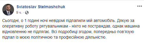 "Сегодня в час ночи неизвестные подожгли мой автомобиль. Спасибо за оперативную работу спасателям - никто не пострадал, однако машина восстановлению не подлежит", - отметил он.