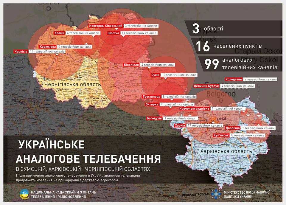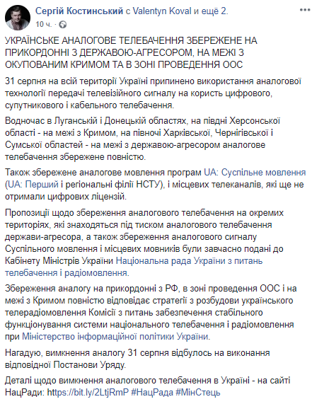 "31 августа на всей территории Украины прекращено использование аналоговой технологии передачи телевизионного сигнала в пользу цифрового, спутникового и кабельного телевидения. В то же время в Луганской и Донецкой областях, на юге Херсонской области - на границе с Крымом, на севере Харьковской, Черниговской и Сумской областей - на границе с государством-агрессором аналоговое телевидение сохранено полностью", - отметил Костинский.