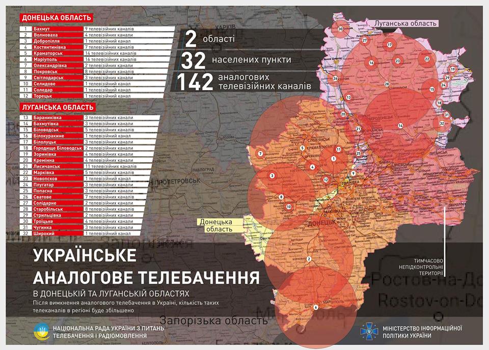 Украинское аналоговое телевидение продолжает работать в Луганской и Донецкой областях, на границе с Крымом и с Российской Федерацией. Об этом сообщил член Национального совета по вопросам телевидения и радиовещания Сергей Костинский на своей странице в Facebook.