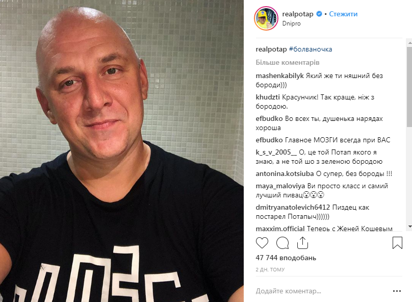На снимке он запечатлен после стрижки налысо. Также Потап избавился от бороды, которую красил в разные цвета: от красного до кислотно-желтого.