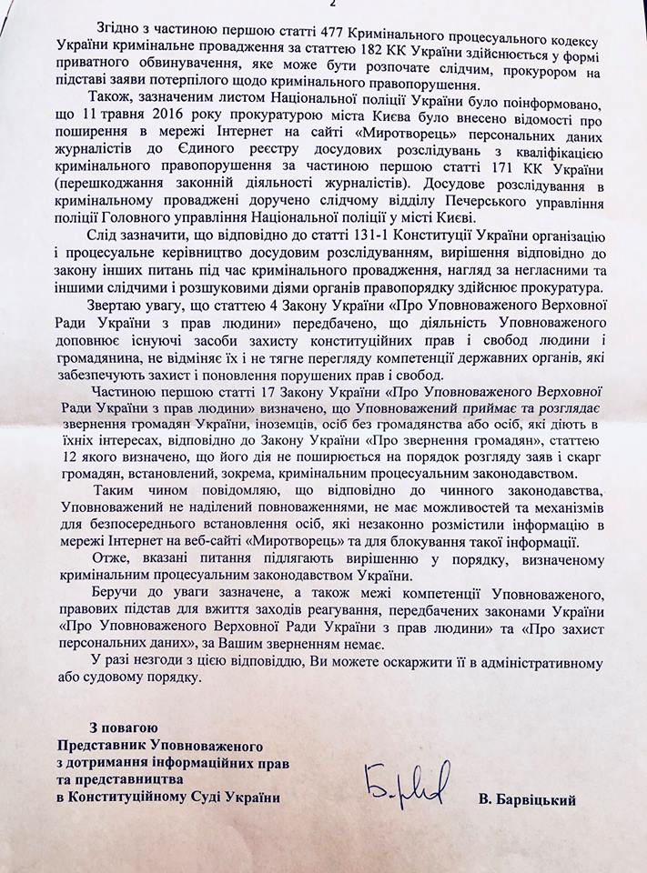 Однако, в ответ на такой запрос журналисты получили отписку из аппарата омбудсмена. "Жалуется Офис уполномоченного на нехватку полномочий (откровенно бы писали, что не хватает желания). Цитирует письмо Национальной полиции от 2016-го года (хотя можно было бы и поинтересоваться ходом расследования, потому что уже сентябрь 2018-го). Говорят, что не могут заблокировать сайт, нет механизмов (хотя заблокировать сайт "Яндекс" и "Одноклассники" в Украине же смогли)" - приводит Томиленко ответ из аппарата омбудсмена и публикует сам документ.