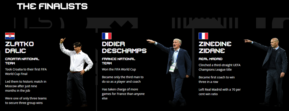В числе номинантов были тренер сборной Англии Гарет Саутгейт, тренер "Ювентуса" Массимилиано Аллегри, тренер "Манчестер Сити" Хосеп Гвардиола, тренер "Ливерпуля" Юрген Клопп, тренер сборной Бельгии Роберто Мартинес, тренер "Атлетико" Диего Симеоне, тренер "Барселоны" Эрнесто Вальверде и тренер российской сборной Станислав Черчесов.