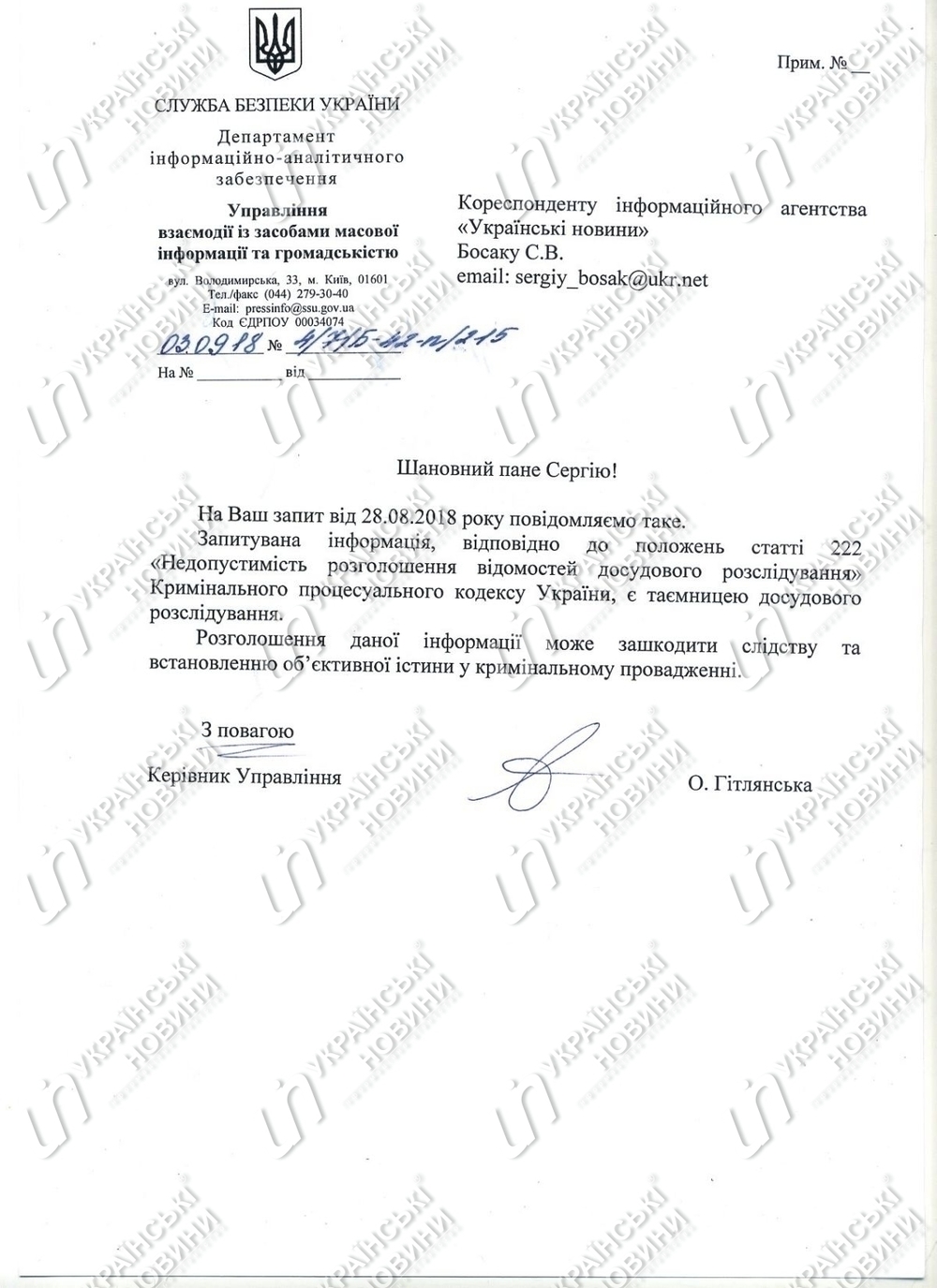 В ответе СБУ на журналистский запрос говорится, что "разглашение информации о ходе расследования может навредить следствию и установлению истины в уголовном производстве".