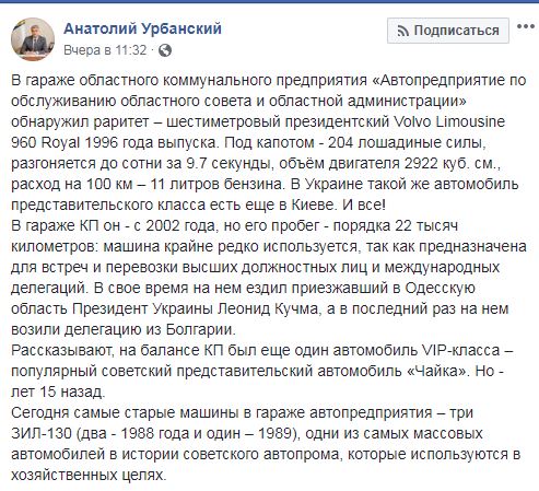 В гараже автопарка Одесского областного совета и областной администрации простаивает лимузин Volvo 960 Royal, которым в свое время пользовался президент Украины Леонид Кучма. Об этом сообщил председатель Одесского облсовета Анатолий Урбанский в Facebook.