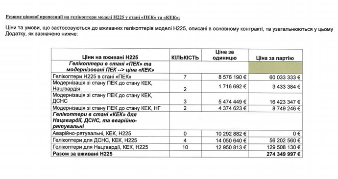 Все вертолеты будут стоить около 485 млн, остаток в 70 млн потратят на техническое обслуживание, обучение и т.д. Вертолеты б/у будут переданы в пользование Нацгвардии, Государственной службы по чрезвычайным ситуациям.