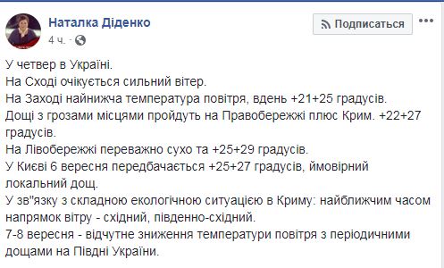 Она пишет, что в Киеве 6 сентября предполагается +25+27 градусов, вероятен локальный дождь.