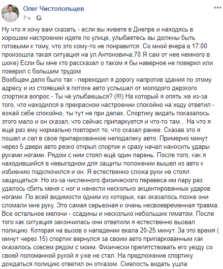 Олег Чистопольцев успел сфотографировать нападавших, их машину. Он очень рассчитывает на быстрое и эффективное расследование. Также он предупреждает пользователей о том, что надо быть готовым к таким ситуациям, когда кому-то не понравится то, как ты улыбаешься.