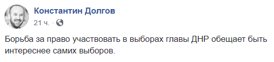 "Политическое решение принято. В ДНР пройдут выборы. Причудливо тасуется колода", - заявил он в Facebook. "Борьба за право участвовать в выборах главы ДНР обещает быть интереснее самих выборов", - позже добавил он.