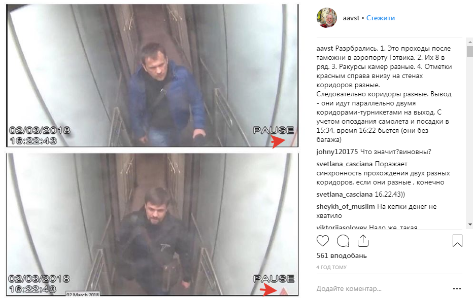 Люди обратили внимание, что на фотографиях подозреваемых, которые опубликовали британские правоохранительные органы, изображен один и тот же коридор аэропорта Гэтвик, а время двух разных снимков с двумя мужчинами совпадает до секунды - 16:22:43.
