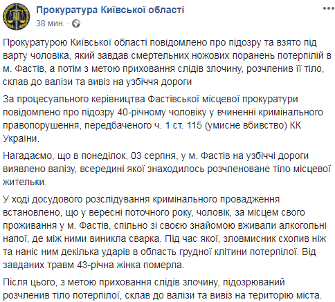 Подозреваемый в убийстве женщины в ходе пьяной ссоры в Фастове и расчленении ее трупа - взят под стражу. Ему сообщено о подозрении сотрудниками прокуратуры Киевской области.