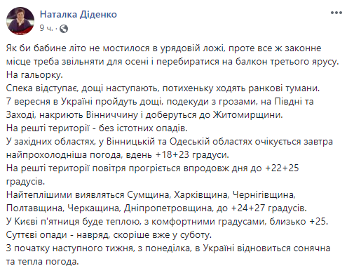 В Украине летнее тепло постепенно сменяется осенними температурами, и это сопровождается дождями и грозами. Как сообщила в Facebook синоптик Наталья Диденко, дожди ожидаются на юге и востоке страны, а также на Виннитчине и Житомирщине. На остальной территории существенных осадков не ожидается.