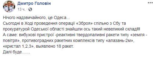 Вчера, 6 сентября, одесская полиция нашла склад ракет "земля-воздух". Об этом на своей странице в Facebook сообщил начальник Главного управления Национальной полиции в Одесской области Дмитрий Головин.