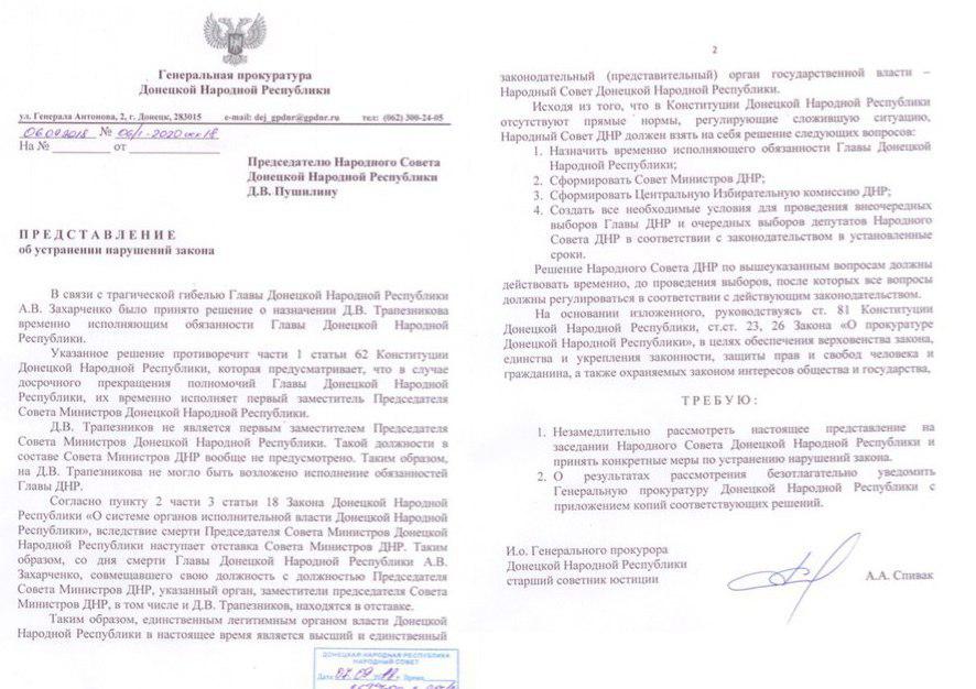 В документе отмечается, что "единственным легитимным органом власти в ДНР" являеетя "народный совет". Поэтому "генпрокурор" просит уже сегодня на заседании Народного совета: