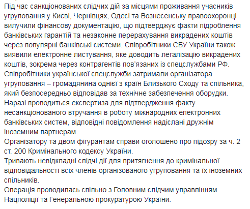 Сотрудники СБУ также обнаружили электронную переписку, в которой говорилось о легализации похищенных средств, в частности через контрагентов, связанных со спецслужбами РФ.