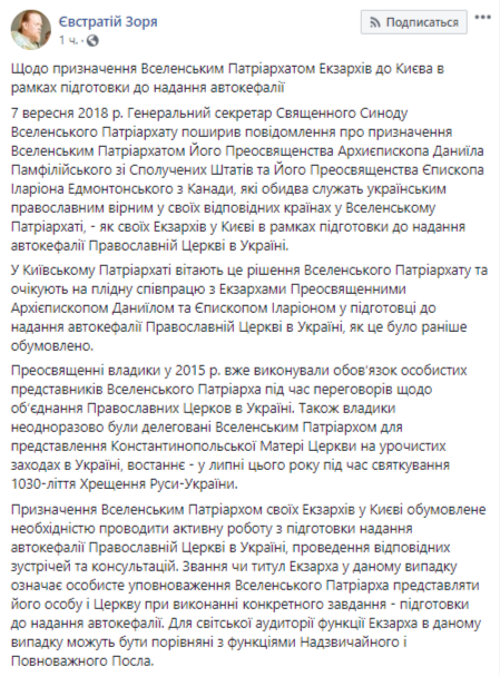 "7 сентября 2018 Генеральный секретарь Священного Синода Вселенского Патриархата распространил сообщение о назначении Вселенским Патриархатом Его Преосвященства Архиепископа Даниила Памфилийскому из Соединенных Штатов и Его Преосвященства Епископа Илариона Эдмонтонского из Канады, которые оба служат украинским православным верным в своих странах во Вселенском Патриархате, - как своих экзархов в Киеве в рамках подготовки к предоставлению автокефалии Православной Церкви в Украине. В Киевском Патриархате приветствуют это решение Вселенского Патриархата и ожидают плодотворное сотрудничество с экзархом Преосвященными Архиепископом Даниилом и епископом Иларионом в подготовке к предоставлению автокефалии Православной Церкви в Украине, как это было ранее оговорено", - говорится в сообщении, которое разместил в Fаcebook архиепископ Евстратий, пресс-секретарь УПЦ КП.