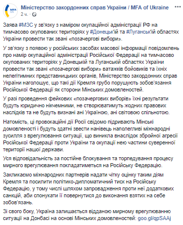 "В связи с появлением в российских средствах массовой информации сообщений о намерении оккупационной администрации Российской Федерации на временно оккупированных территориях в Донецкой и Луганской областях Украины провести так называемые "внеочередные выборы" главарей боевиков и их нелегитимных представительских органов. Министерство иностранных дел Украины отмечает, что такие действия Кремля грубо нарушают обязательства Российской Федерации как стороны "минских договоренностей", - говорится в заявлении.