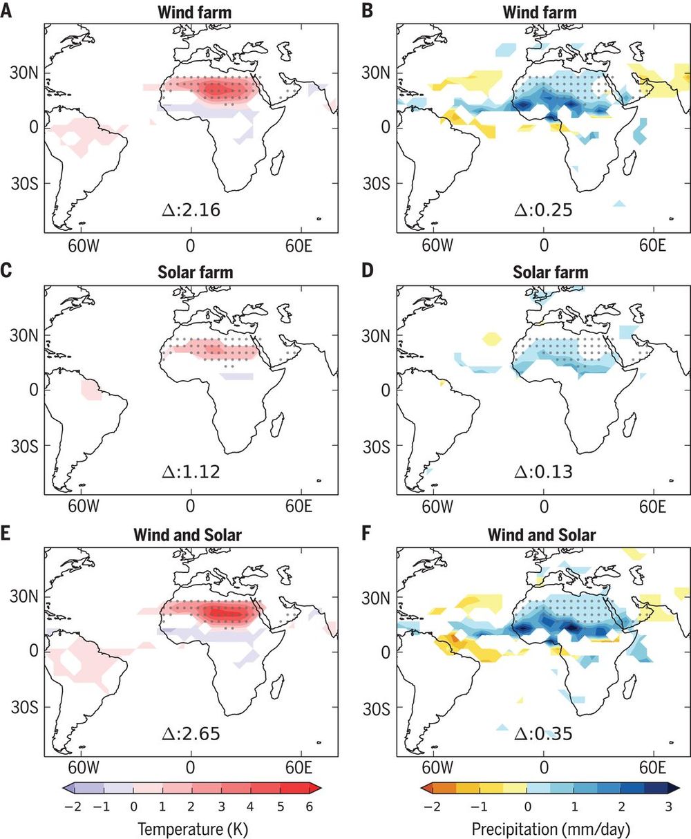 Влияние ветряных и солнечных электростанций в Сахаре на среднюю температуру и осадки. Серые точки означают одну "станцию".
