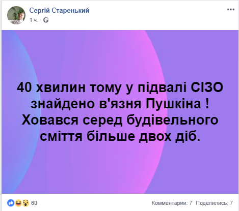 8 сентября, спустя 2 дня после исчезновения, был найден 19-летний Виталий Пушкин, которого ранее недосчитались в Лукьяновском СИЗО. Об этом сообщил экс-начальник пенитенциарной службы Сергей Старенький на своей странице в Facebook.