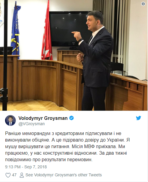 "Я должен решать этот вопрос. Миссия МВФ приехала. Мы работаем, у нас конструктивные отношения. За две недели сообщим о результатах переговоров", - заявил Гройсман.