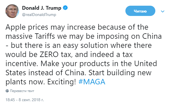 "Цена на продукцию Apple может вырасти из-за огромных пошлин, которыми мы можем обложить Китай - но есть простое решение, в котором были бы нулевые налоги и настоящие налоговые стимулы. Производите свои товары в США, а не в Китае. Блестящее решение!", - написал Трамп.