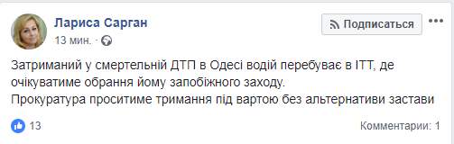 Как сообщила пресс-секретарь генпрокурора Украины Лариса Сарган на своей странице в Facebook, решается вопрос об избрании меры пресечения для водителя. Прокуратура будет настаивать на содержании под стражей.