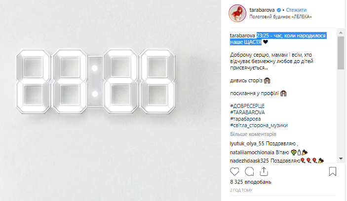 "23:25 - время, когда родилось наше счастье", - написала певица в соцсети. Также на странице указано, что Тарабарова находится в роддоме "Лелека" в Пуща-Водице в Киеве.